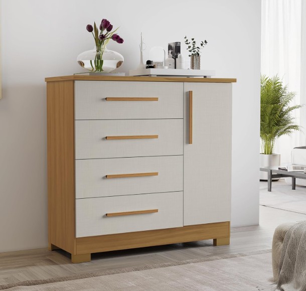 Caracteristicas; Estrutura MDP 1 Porta 4 Gavetas Corrediça telescópicas Prateleira Pés Puxador MDF Dimensões: Altura: 108,5 cm Largura: 108 cm Profundidade: 45 cm Peso: 48,41 kg