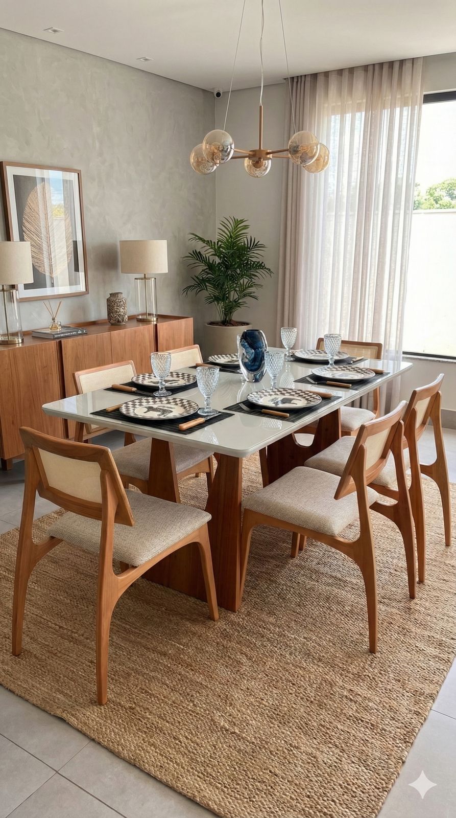 Preços unitários: Mesa de madeira, tampo vidro temperado: R$2.185,00 Cadeira de madeira, assento estofado e encosto tela: R$ 795,00