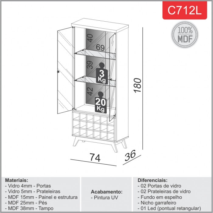 Dimensões: Comprimento: 180 cm Largura: 74 cm Espessura: 36cm Peso: 71,30 kg