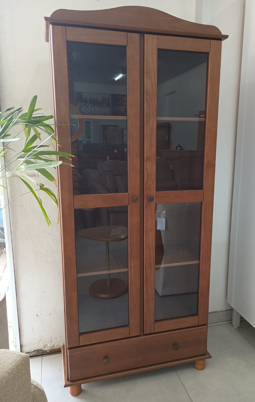 Cor Café; Produto 100% Madeira Maciça de pinus de reflorestamento; Pintura Acetinada Verniz PU e UV; Corrediças telescópicas; Dobradiças metálicas; Peso máximo suportado pela Gaveta 05kg distribuídos; Puxadores metálicos em ouro envelhecido; Pés tornecados em madeira maciça; Vidro liso incolor; Prateleiras em madeira maciça (Peso suportado 10kg distribuídos);