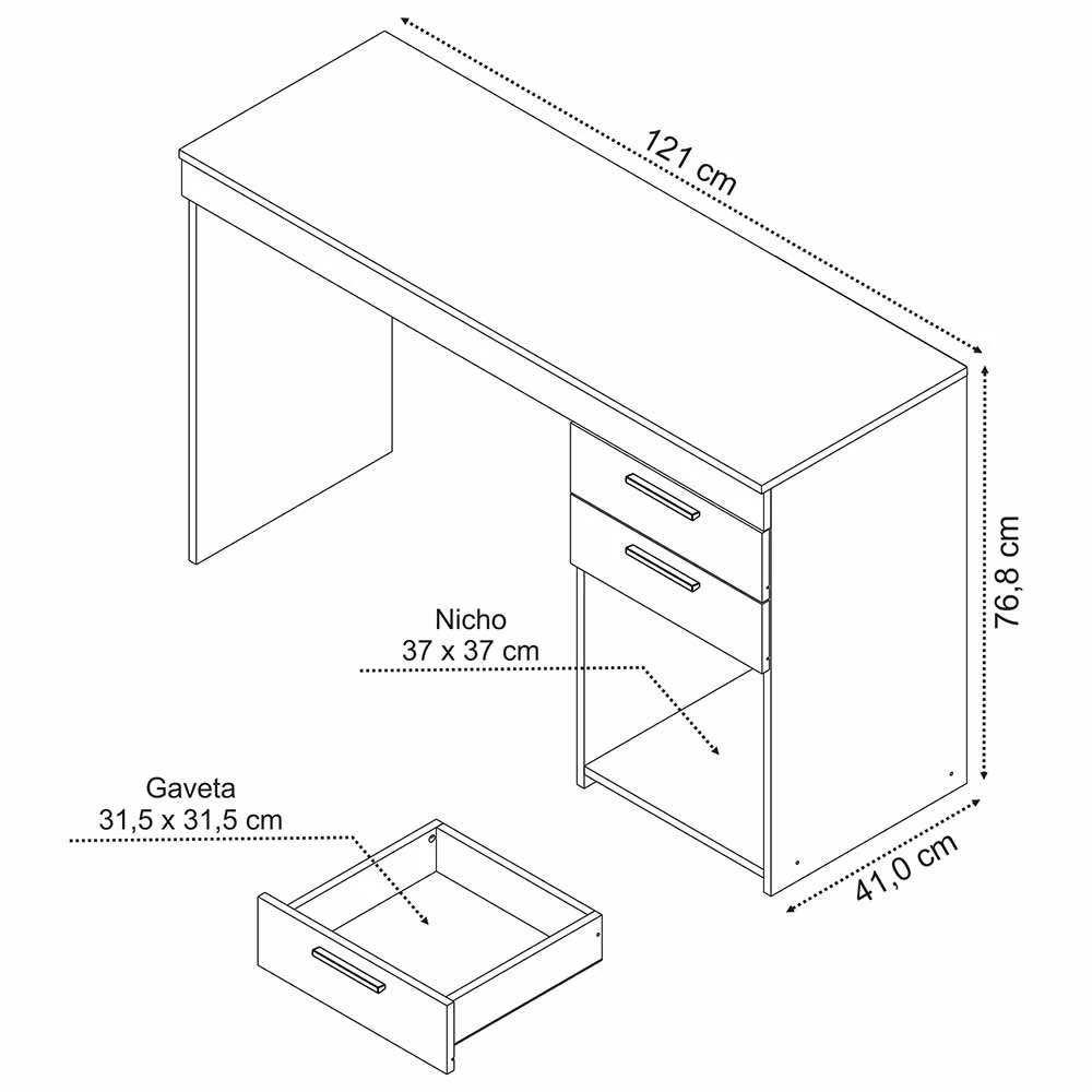 Com um design moderno e funcional, ela oferece o equilíbrio perfeito entre espaço e sofisticação. Com doias gavetas equipadas com corrediças metálicas, a mesa proporciona um deslizamento suave e silencioso, além de garantir maior resistência e durabilidade. Ideal para armazenar seus utensílios e documentos de forma prática e organizada. O Design contemporâneo dos puxadores em alumínio, com acabamento refinado, não só dão um toque de elegância ao móvel, mas também aumentam a durabilidade da mesa, garantindo que ela se mantenha impecável por muito mais tempo. O nicho espaçoso foi pensado para otimizar seu espaço, oferecendo local perfeito para guardar objetos pessoais ou pequenos acessórios, mantendo seu ambiente de trabalho sempre arrumado e funcional. Os pés de plástico com sapatas de 5mm trazem um design contemporâneo e oferecem excelente estabilidade, permitindo que a mesa suporte até 25kg com segurança, sem perder a elegância