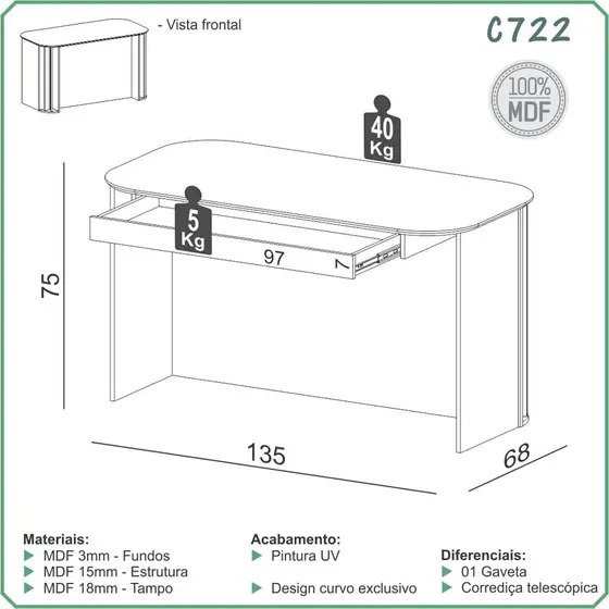 Escrivaninha Ripada com tampo arredondado 1,35m 1 gaveta C722 Dalla Costa