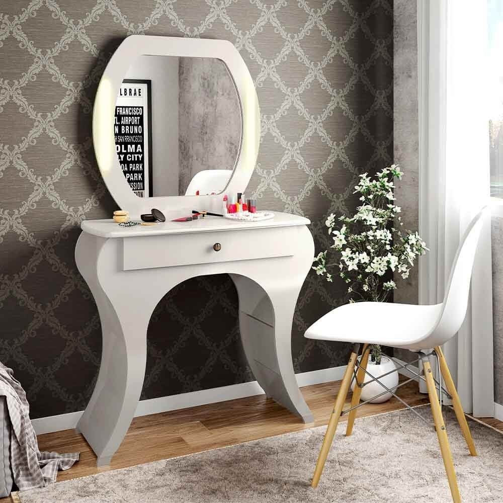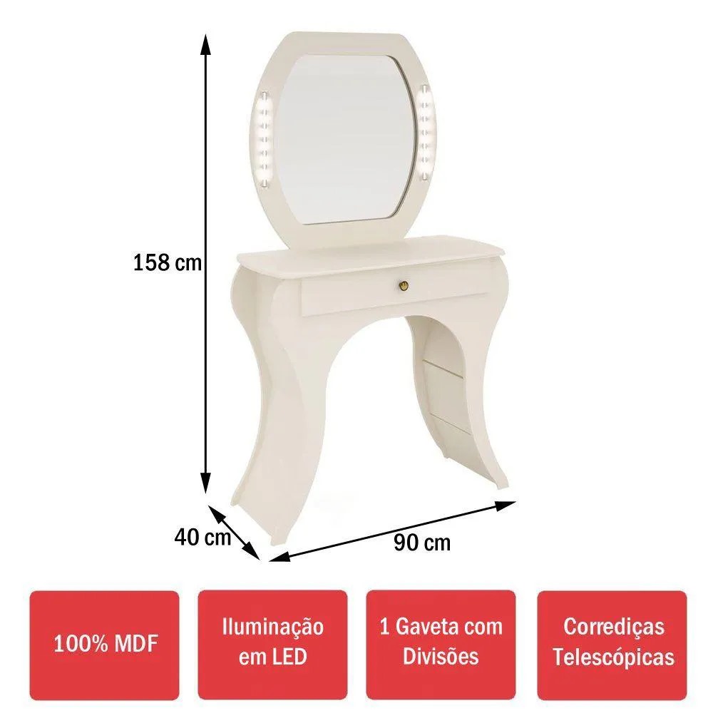 Está em busca de um móvel prático, funcional e muito lindo? A Penteadeira Retrô é perfeita para te dar o apoio em todas as manhãs e ainda decorar seu ambiente. Possui 1 gaveta e 1 espelho com uma moldura super clássica. Também possui LED nas laterias do espelho. Seu material é 100% MDF com acabamento…