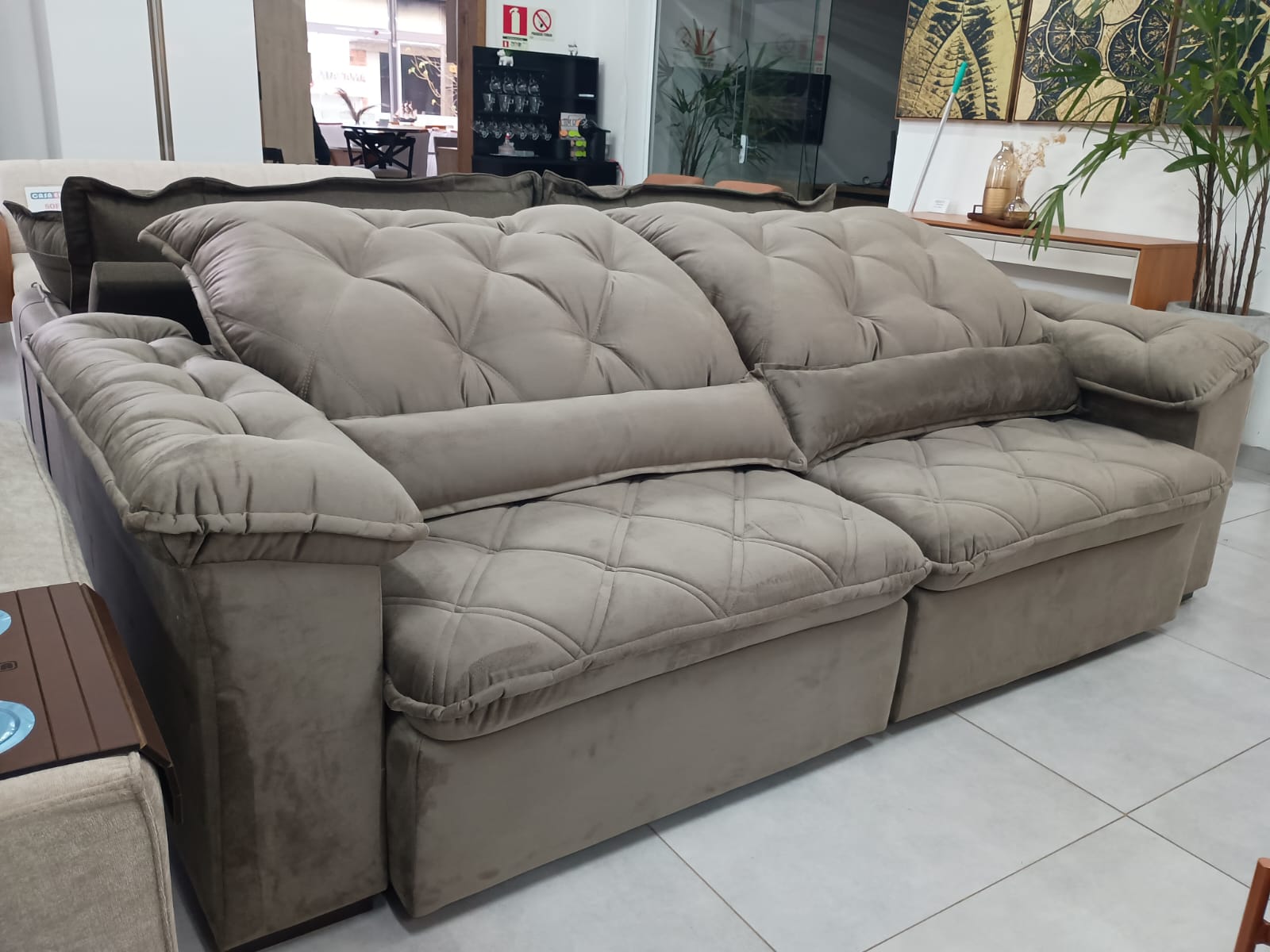 Assento retrátil, corrediças metálicas e persintas elásticas, espuma D28, molas ensacadas e individuais bonnel. Encosto reclinável com catraca de 7 posições, almofadas fixas, fibra siliconada. Largura 2,50m Profundidade fechado 1,23m Aberto 1,80m