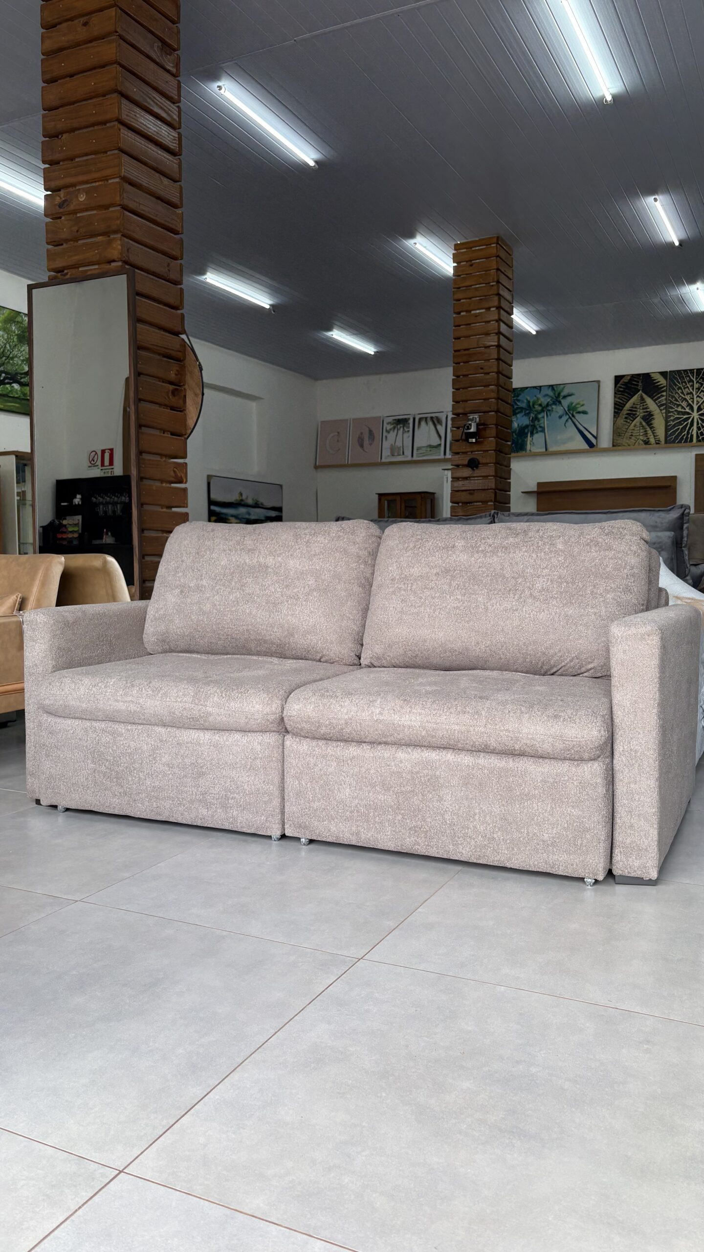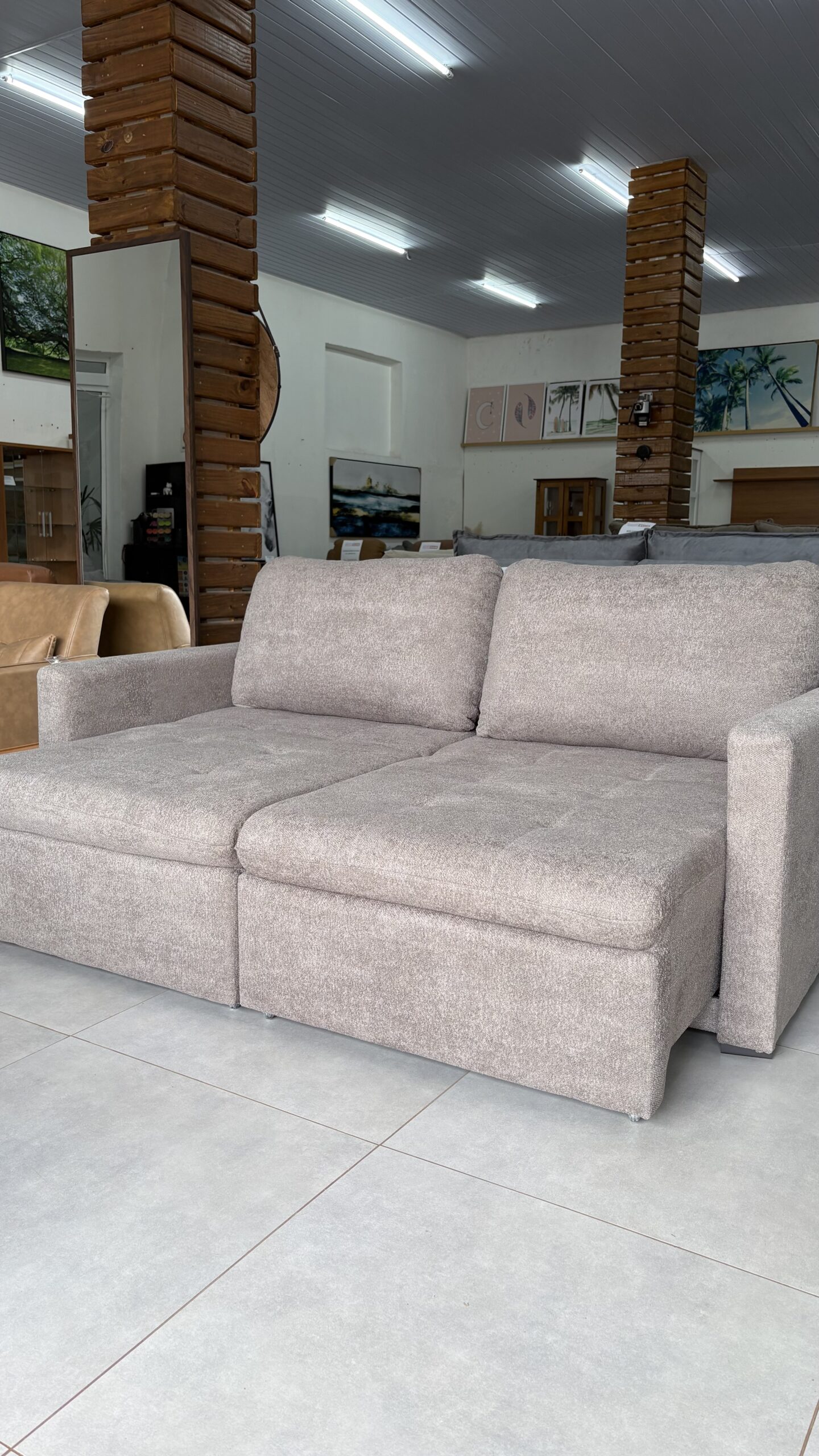 Possui assento retrátil, proporcionando versatilidade e conforto extra nos momentos de relaxamento. O assento é composto por espuma D-28, molas espirais e percintas elásticas, garantindo sustentação e durabilidade.