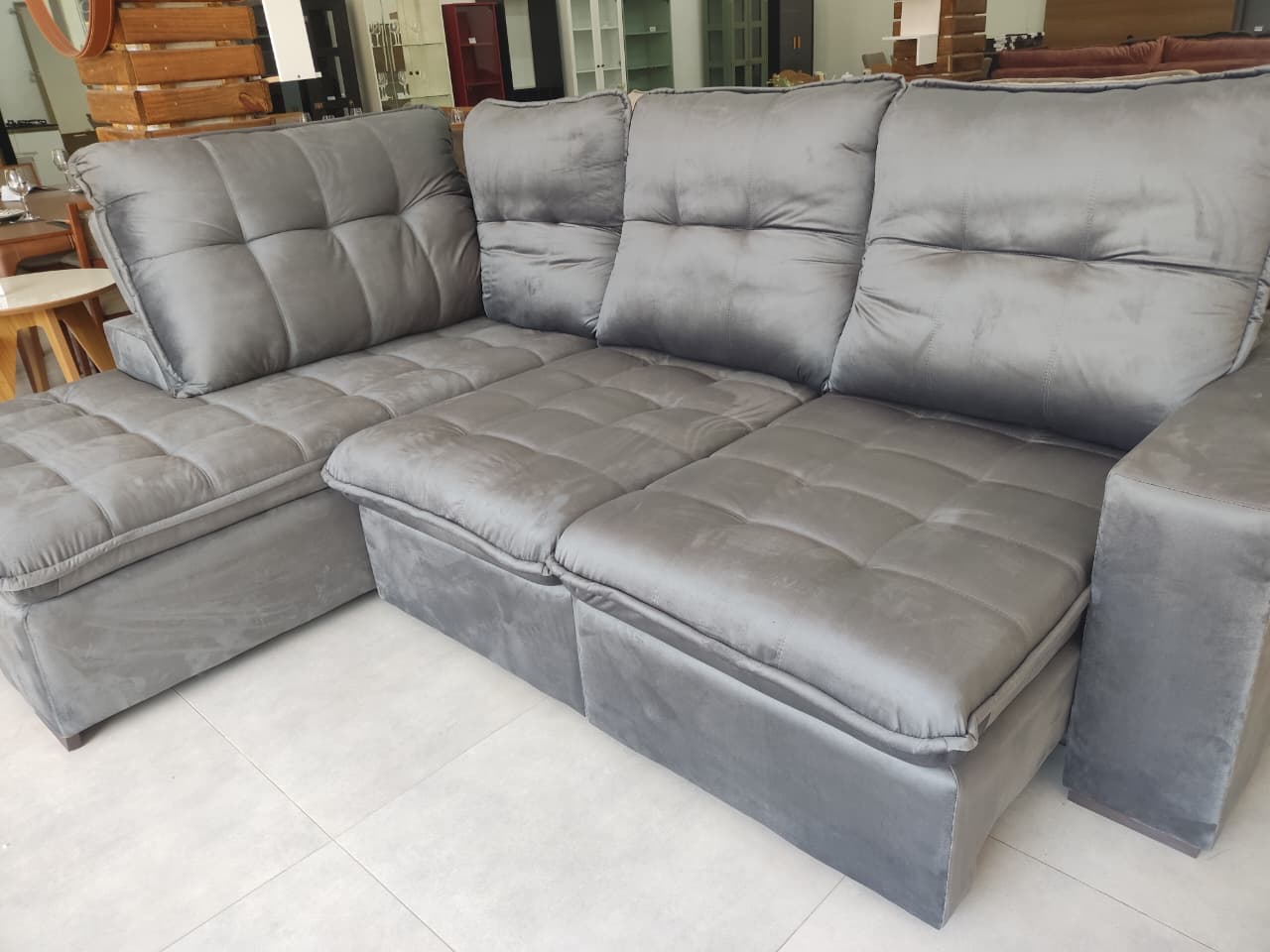 Assento Retrátil, corrediças metálicas e persintas elásticas, espuma D28, molas individuais bonnel. Encosto Reclinável, com catraca blindada 7 posições. Almofadas fixas, fibra siliconada. Tamanho 2,90 x 2,23m
